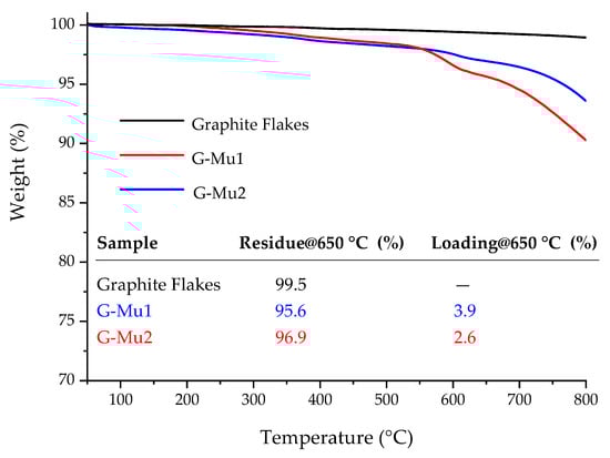 TGA profiles of graphite flakes (black line), G-Mu1 (red line), and G-Mu2 (blue line) in the N2 atmosphere. The inserted table reports the values, at 650 °C, of the weight residue (%) and loading (%).
