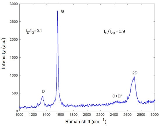The Raman spectrum is characterized by the well-known D band, at about 1350 cm−1, ascribed to the structural imperfections of graphene, the G band at about 1580 cm−1, followed by the G* band (commonly denoted as D + D″, resulting from the double-resonance Raman scattering processes) in the 2400–2450 cm−1 spectral region, and the second-order overtone 2D mode at about 2690 cm−1 [5] (Figure 4, the Raman spectrum of graphite is reported in S1). The ID/IG and IG/I2D peak intensities ratio are 0.1 and 1.9, respectively. The first ratio, which characterizes the level of disorder in the sample, is very low, indicating that the functionalization does not affect the pristine graphite structure. Further, the high IG/I2D ratio and the wide 2D band indicate the presence of several graphene layers, in good agreement with the STEM analysis. Empirically, the G band position can be correlated to the number of atomic layers by the following relation: wG = 1581.6 + 11/(1 + n1.6) where wG is the band position in wavenumbers, and n is the number of sheets present in the sample. In our case, we estimated n = 3, in good agreement with STEM evidence. Furthermore, a thickness of about 2–3 nm was estimated.