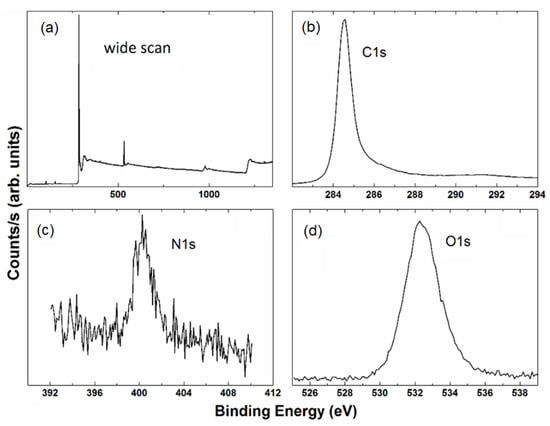 The C 1s spectrum is characterized by a broad band in the 283–290 eV region, typical of a carbon-based system. The main feature is a band peaked around at 284.5 eV and attributed to C=C/C–C in the aromatic ring, plus some other features resulting from the overlapping of higher binding energy bands. These contributions are ascribed to carbon atoms bonded to nitrogen (C–N), and oxygen in different surface functionalities (C–OH, C–O, C=O) centered at 285.2, 286.3, 288.7, 288.9, and 291 eV, respectively. The graphene functionalization is evidenced by the N1s profile, which is dominated by a broad band centered at about 400 eV due to nitrogen-carbon bonds. Finally, an O 1s broad band, characterized by the contribution from oxygen bond singly and doubly to carbon, centered at about 533.6 eV and 531.9, was also detected.