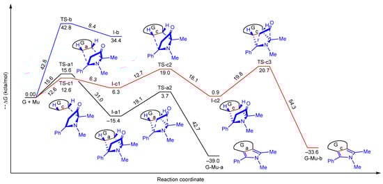 The most important transition states (TS-a–c), intermediates (I-a–c), and product structures (G-Mu-a,c) have been schematized in Figure 6, whereas their energetic parameters have been summarized in Table 2 and Table S1.