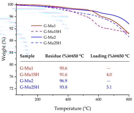 TGA profiles of G-Mu1 (red line), G-Mu2 (blue line), G-Mu1SH (red dashed line), and G-Mu2SH (blue dashed line) in a N2 atmosphere. The inserted table reports the values, at 650 °C, of the weight residue (%) and loading (%).