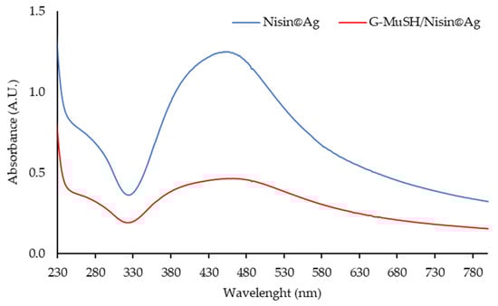 According to the literature methods, NaBH4 was used in combination with a peptidic natural matrix to prepare Ag NPs [46,47]. Unlike other polymer matrices [46,48], nisin was found to be unable to reduce noble metal ions without NaBH4. Nisin acted as a stabilizing ligand to produce nisin-coated Ag NPs (Nisin@Ag), also in the presence of G-MuSH (G-MuSH/Nisin@Ag). In both the experiments, the color of the solution turned reddish-black after a few minutes, suggesting Ag nanostructure formation. The typical Ag plasmon resonance absorption feature, detected at about 430 nm for the Nisin@Ag sample, confirmed the Ag NPs formation (Figure 8). In addition, SPR lost most of its distinctive features in the G-MuSH/Nisin@Ag sample, due to the NPs size change and the effects of stabilizing molecules, which induce significant broadening of the extinction bands, as generally observed in the case of thiolated Ag NPs [49].