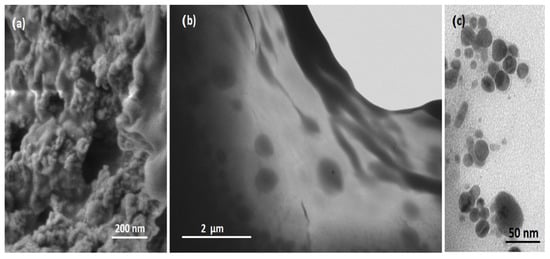SEM (a) and STEM images (b,c) of the G-MuSH/Nisin@Ag sample.