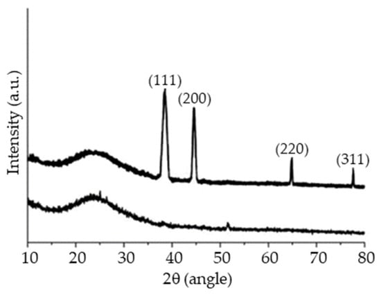 XRD (Figure 10) is used for the determination of the crystal structure and lattice parameters. A broad diffraction peak at about 25.5° can be seen in the G-MuSH sample, a typical feature of reduced graphene oxide [50]. In addition, the XRD pattern of the G-MuSH/Nisin@Ag composite shows the characteristic peaks at about 38.2°, 44.5°, 64.6°, and 77.6°, assigned to the (111), (200), (220), and (311) crystallographic planes of the Ag face-centered cubic structure (JCPDS, file No. 04-0783), confirming the formation of Ag NPs in the composite.