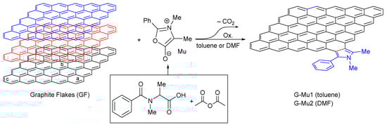 The chemistry and the reactivity of mesoionic compounds have been extensively investigated by our research group in the last years [16,17,18,19], including the thermally induced addition of mesoionic (dipole) oxazolones to graphite flakes under solvent-free conditions for the direct production of a graphene sheet decorated with 2H-pyrrole derivatives (Figure 1, pathway d) [5].