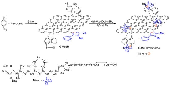 The reactivity and the processability of münchnone functionalized graphene were exploited to produce enriched nano biomaterials with antimicrobial activity. Specifically, G-Mu was functionalized with benzene thiol groups by a reaction with the diazonium salts [43,44] prepared from 4-aminothiophenol, and used to produce the novel antibacterial graphene-based nanocomposite G-MuSH/Nisin@Ag (Scheme 2). We envisioned that benzene thiol groups grafted on G surfaces could provide anchorage to inorganic and organic antimicrobial agents such as Ag NPs and antimicrobial peptides. Among the family of antimicrobial peptides, we selected nisin as a model for our studies since it possesses a unique chemical structure characterized by three unusual amino acids (dehydroalanice, lanthionine, and β-methyl-lanthionine) and five internal sulfide bridges that, together with basic residues of Lys and Asp, contributed to stabilizing Ag NPs. Moreover, nisin is a heat-stable pentacyclic peptide, commercially available at low cost in its unpurified form [25,45].