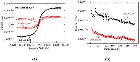 Magnetic measurements were performed for as-deposited stacked nanostructures by applying a magnetic field in the film plane. The structures demonstrated at room temperature nonlinear hysteretic magnetization, generally characteristic to ferromagnetic, ferrimagnetic, and superparamagnetic materials, at room temperature with saturation magnetization (Figure 7a). In the magnetization-field (M-H) curves, the saturation magnetization values for the SnO2/ZrO2/Si and ZrO2/SnO2/Si nanostructures reached 1.5 × 10−4 and 3.5 × 10−4 emu, respectively. Both double-layered nanostructures showed measurable coercivity, ranging approximately from 65 to 130 Oe (5.2 to 10.4 kA/m). The saturation magnetization Ms, recorded at 1 kOe against temperature (Figure 7b), followed a linear trend, decreasing moderately with increasing temperature. Single ZrO2 film on Si substrate exhibited magnetization lower than 2 × 10−6 emu and insignificant coercivity, which is also consistent with the results of our earlier studies [32]. However, single ZrO2 films, grown to higher thicknesses, otherwise can exhibit considerable hysteretic magnetization, nonlinear in external fields, as has been observed in several works earlier [33,34,35], probably due to the stabilization and presence of metastable phases, rich of oxygen vacancies. The latter inevitably accompanies the nanocrystalline nature of the thin solid structures and concurrent stabilization of metastable polymorphs. The role of vacancies as likely the main factor affecting the surface energies and inducing stabilization of metastable polymorphs in nanocrystalline ZrO2 has earlier been studied and is a widely recognized phenomenon [36,37,38,39,40]. Magnetic properties may, in a somewhat similar manner, appear and become measurable in SnO2 based oxide films. The room temperature ferromagnetism has been detected in SnO2-based nanostructures not mixed with foreign cations, as reported in several papers [41,42,43,44].
