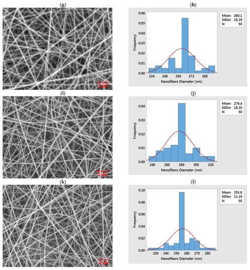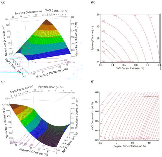 | Run Order | Applied Voltage (kV) | Spinning Distance (cm) | Polymer Conc. (wt %) | Flow Rate (mL h−1) | Conc. of NaCl (wt %) | Nanofibers Diameter (nm) |