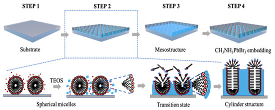 A schematic representation of preparation process of embedding the MAPbBr3 in a mSiO2 composite structure. Second line shows the formation process of ordered mesoporous silica films with perpendicular mesochannels by the Stöber solution spontaneous growth procedure.