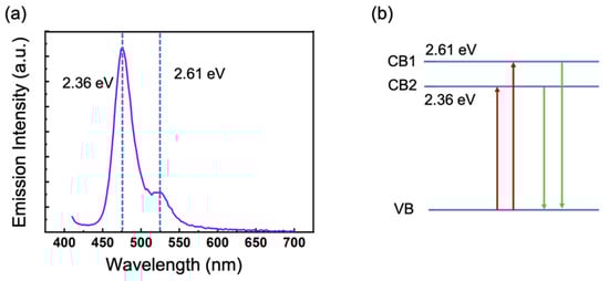(a) PL spectrum of perovskite embedding in mesopores under 375 nm pumped emission. Two peaks appeared at 475 and 525 nm, which corresponded to 2.36 and 2.61 eV, respectively. (b) Schematic showing 475 and 525 nm photoluminescence and optical absorption.