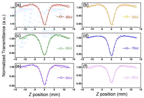 Figure 5a–f demonstrates the typical Z-scan curves of the nanocomposite samples, exhibiting obvious nonlinear responses at 800 nm, under excitation pulsed energy from 40 to 90 nJ, respectively. The dots were the original detecting data. The data show a symmetrical undulating distribution to the center position (z = 0). With the positioning of z from the outside to the center position, the transmission ratio appeared to increase first and then decrease. The undulations indicate that two different absorption mechanisms may appear in nonlinear responses. Therefore, we used a formula that combines the existence of two mechanisms, including two-photon absorption and saturable absorption, to curve-fit the data. The formula is as follows [33,34],
