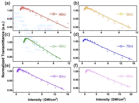 (a–f) Normalized transmission as a function of incident laser intensity from 40 to 90 nJ. The scatters are experimental data and solid lines are the fitting curves.