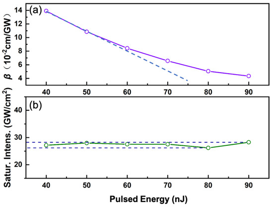 After formula fitting, varying values of β were obtained and the positive values indicate a nonlinear response including two-photon absorption, as shown in Figure 7a. The value of β is a range from ~4.3 to ~13.9 × 10−2 cm/GW. In addition, the nonlinear absorbed coefficients exhibited the saturation effect. It is obvious that the rate of change of β tends to be flat with the increase of pulse energy. The blue dashed line depicts the initial slope of the β value, which as the pulse energy increases, then becomes significantly smaller.