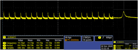Figure 9 gives a description of the typical pulse trains at the maximum average output power captured by the digital oscilloscope (MDO4104C, Tektronix, Beaverton, OR, USA) with 1 GHz and a fast photodiode detector (ET-5000, Electro-Optics, Traverse City, MI, USA).