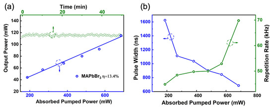 In Figure 10, the repetition rate, pulse widths, average output power and instability of the laser are plotted for different transmissions. Figure 10a shows the experiment output power of the Q-switched laser operation, which is as a function of absorbed pumped power with the maximum value of 115 mW. The top axis corresponds to the stability of the Q-switched laser operation under maximum pumped power over 50 min. The value of power instability was estimated to be 4.2%. Figure 10b shows the experimental pulse parameters of the lasing, of which blue symbols and lines correspond to the left axis and green ones correspond to the right axis. When the absorbed pump power increased, the repetition rates gradually increased while the pulse widths decreased; the highest pulse repetition rate was 70 kHz and the lowest pulse width was 686 ns, corresponding to pumped power of 700 mW. The repetition rates of the Q-switched laser system were exhibited in a tunable range from 45 to 70 kHz as the absorbed pump power increased while the output power was steady with time, which shows the samples were stable in working condition.