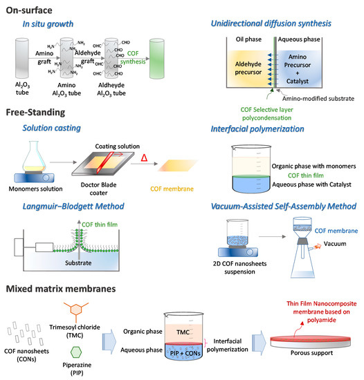 With the aim of replacing the current polymeric membranes used for water treatment, different approaches have been reported in the preparation of COF-based membranes. These approaches differ depending on whether the COF-based membrane has been prepared free-standing, with the help of some porous support (on-surface), or as hybrid membranes in which COF acts as filler of a polymer matrix, giving rise to what is known as mixed matrix membrane (MMM) (Figure 3).