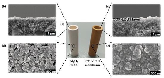 (a) Photographs of an untreated Al2O3 tube and a tubular COF-LZU1 membrane. (b,c) Cross-sectional SEM images of an untreated Al2O3 tube (b) and a tubular COF-LZU1 membrane (c). (d,e) Top-view SEM images of an untreated Al2O3 tube (d) and a tubular COF-LZU1 membrane (e). Reprinted with permission from [26]. Copyright (2018) John Wiley and Sons publications.