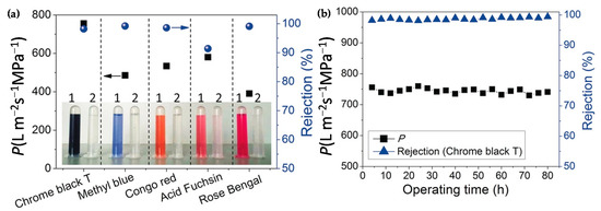 (a) Water permeance and rejection rates of the tubular COF-LZU1 membrane in the NF of different dyes (photographs show the colors of the dye solutions before (1) and after (2) NF). (b) Stability test of the tubular COF-LZU1 membrane in a long-time NF of CB. Operating pressure: 0.5 MPa; dye concentration: 100 mg L−1; room temperature. Reprinted with permission from [26]. Copyright (2018) John Wiley and Sons publications.