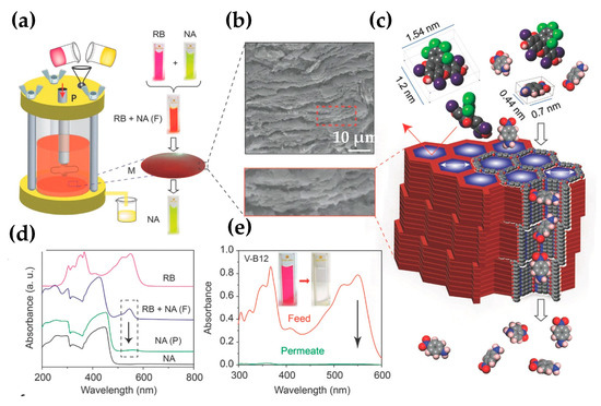 (a) Scheme of the nanofiltration assembly and selective molecular separation of NA from a mixture of NA and RB, (“F” denotes feed and “P” for permeate); (b) SEM cross-section showing stacked layer sheets in M-TpBD; (c) Scheme for molecular sieving mechanism through M-TpBD; (d) UV–vis spectra of selective recovery of NA from mixture of RB and NA from water; (e) UV–vis spectra of vitamin-B12 (V-B12) and the filtrate water after passing through M-TpBD. Reprinted with permission from [33]. Copyright (2016) John Wiley and Sons publications.