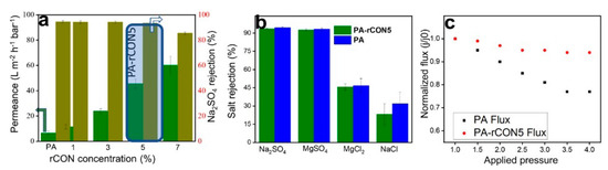 Performance evaluation of membranes: (a) desalination of PA and PA−rCON5, (b) different salt rejection, and (c) flux at different pressure. Reprinted with permission from [44]. Copyright (2020) American Chemical Society.