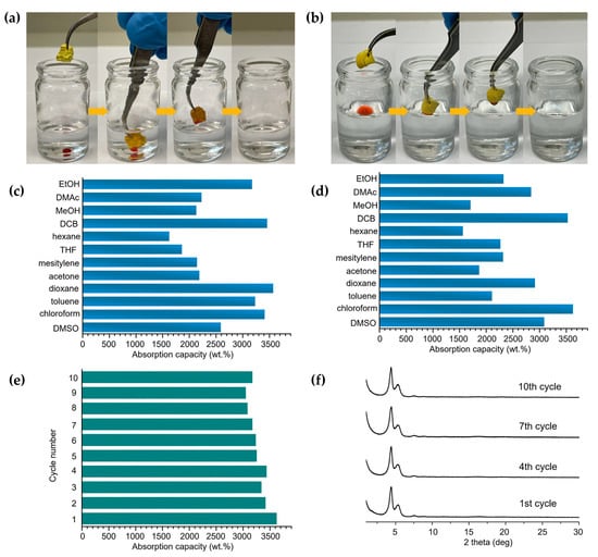 Summary of the performance of TAPB-TFPA and TAPB-OMePDA COF aerogels for the absorption of organic solvents. (a,b) Digital photographs of absorption of (a) dyed chloroform and (b) dyed silicon oil from water. (c,d) Organic solvent absorption capacities of (c) TAPB-OMePDA COF aerogel and (d) TAPB-TFPA COF aerogel. (EtOH: ethanol; DMAc: dimethylacetamide; MeOH: methanol; DCB: dichlorobenzene; THF: tetrahydrofuran; DMSO: dimethyl sulfoxide). (e) Performance of the TAPB-TFPA COF aerogel over multiple cycles of absorption of chloroform and (f) PXRD spectra of the recycled TAPB-TFPA COF after multiple cycles of absorption, washing, and drying. Reprinted with permission from [16]. Copyright (2021) American Chemical Society.