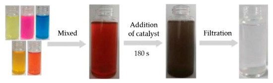 The reduction of several dyes by Ag@TPHH-COF was also studied for their catalytic hydrogenation reduction. The organic dyes selected were RhB, MB, MO, and CR. Right after the catalyst is added, the color of the solution disappears quickly, showing that the reduction of the dyes occurs rapidly in the presence of Ag@TPHH-COF. Decolorization times of RhB, MB, MO, and CR were 270 s, 120 s, 240 s, and 600 s. The Ag@TPHH-COF catalyzes the hydrogenation reaction of -N=N- and -C=N- groups and destroys their conjugated structure. The values of kapp were 0.0127 s−1, 0.030 s−1, 0.0180 s−1, and 0.005 s−1, respectively. To finally determine the applicability of the catalyst for reduction reactions of a simulated wastewater sample, the group carried out the experiment mixing the four dyes and 4-NP (Figure 16). After adding NaBH4 and the catalyst and stirring for 3 min, the solution was filtered and found colorless.