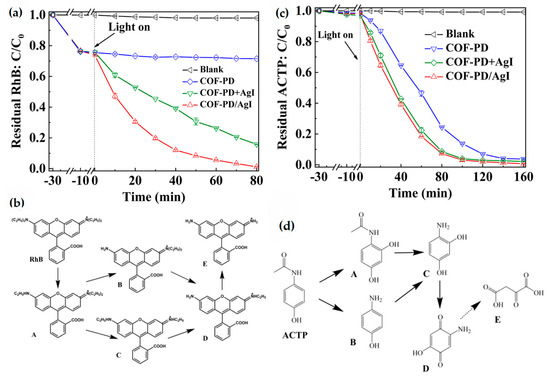 The photocatalyst fabricated by Tong Liu et al. [55] in 2020, based on an AgI modified COF, COF-PD/AgI, using 2,5-diaminopyridine and 1,3,5-triformylphloroglucinol as precursors, also demonstrated good efficiency in organic pollutants degradation. In this case, the reaction consisted of a visible light-driven (VLD) photocatalytic process. COFs present periodic π-conjugated aromatic units that make them good organic semiconductors to serve as the pathway for electrons (e−)-holes (h+) transport. Because it has been demonstrated before that heterojunction could promote the separation of photo-induced e− and h+ in VLD photocatalysis, the authors modified the COF with AgI, to enhance the performance of the catalyst under visible light. AgI is ideal due to its good absorption of visible light and optimal band position. The synthesis starts with the obtention of COF-PD via solvothermal reaction, followed by co-precipitation of AgI (diameter of 5–20 nm) to obtain the COF-PD/AgI, and its performance towards organic pollutants degradation was tested for RhB and Acetaminophen (ACTP), which is an antipyretic drug that belongs to the pharmaceutical and personal care products family (PPCPs). RhB is completely removed by the COF-PD within 80 min (Figure 17a), being the pseudo-first kinetic constant 4.66 × 10−2 min−1, whereas under dark conditions, only around 25% of the dye is adsorbed. It confirms the improvement of the photocatalytic degradation of RhB, thanks to the heterojunction between the COF and AgI nanoparticles. The process proposed for the degradation of RhB is N-deethylation (Figure 17b). ACTP’s complete removal by COF-PD/AgI under visible light irradiation happens within 60 min (k = 3.34 × 10−2 min−1) (Figure 17c). Whereas under dark conditions, the material removes less than 2% of ACTP. In this case, the degradation process follows up a hydroxylation reaction (Figure 17d). The photocatalyst shows good performance within four cycles towards the two pollutants with a removal percentage of 97 and 99%, respectively.