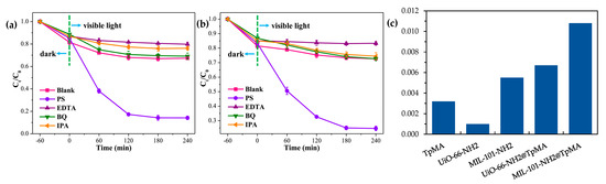 The functionalization of MOFs and COFs can turn these materials into promising photocatalysts, for example, introducing nitrogen-rich functional groups would improve the visible-light response of the COF. The catalysts will act as activators of PS for the degradation of BPA by using solar energy. The preparation of the hybrid composites was following a one-step hydrothermal method. For the prepared catalysts, an increase of the absorption was observed, attributed to the introduction of the C3N4 units, that act as visible-light active centers that facilitate the generation of photo-produced charge carriers. The results showed that the photocatalytic performance of the resultant MIL-101-NH2@TpMA and UiO-66-NH2@TpMA towards BPA (Figure 18a), were enhanced by the introduction of the C3N4 and the heterojunction formed at the interface with covalent bonds was beneficial for the separation and transfer of photogenerated electro-hole pairs. Pseudo-first-order kinetics show that the degradation rates of the catalysts for BPA are higher than the precursors (Figure 18b). The highest kinetic rate constant obtained belonged to the MIL-101-NH2@TpMA, with a value of 0.0108 min−1, and the highest degradation efficiency was achieved with a PS concentration of 20 mg, being 99% for the MIL-101-NH2@TpMA and 82% for the UiO-66-NH2@TpMA. Both catalysts were reusable for over five cycles, reaching a 83 and 69% degradation efficiency, respectively.