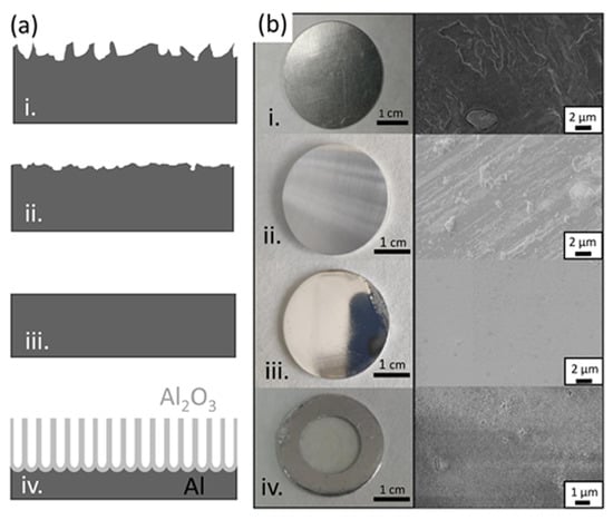 Figure 1. (a) Schematics of the cross-section of the aluminum samples during the alumina template preparation: (i) starting material, (ii) after mechanical polishing, (iii) after electrochemical polishing and (iv) after the anodization process and Al etching. (b) shows the surface morphology optical images (left) and scanning electron micrographs (right).