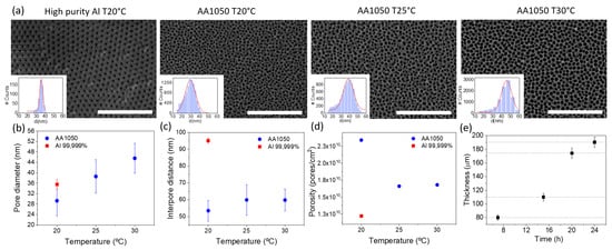 Figure 2. (a) Top-view images of AAO templates, anodized from different starting materials in 0.3 M oxalic acid, applying 40 V over 2 h at different temperatures. Histograms represent the pore size distribution and is calculated from different images, using ImageJ software. The scale bar is 1 μ m in all images. (b) Pore diameter (c) interpore distance and (d) pore density vs. anodization temperature for Al 99.999 % and AA1050, calculated from the images in (a). Error bars are calculated from the standard deviation of the Gaussian fits of the histograms. (e) Evolution of the thickness of alumina templates as a function of the anodization time.