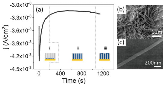 Figure 3. (a) Evolution of current density with time during the electrodeposition of CoFe NWs in a nanoporous alumina template. Three characteristic regions can be distinguished: (i) nucleation, (ii) NWs growth and (iii) overgrowth. (b,c) are SEM images of CoFe NWs at two different magnifications.