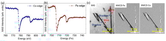 Figure 4. (a,b) X-ray absorption spectra of Co and Fe. (c) XAS image for CoFe NWs and XMCD image at Fe L 3 and Co L 3 edges for the same wires where it is possible to distinguish magnetic contrast only in the shadow of the wires. The scale bar is 1 μ m.