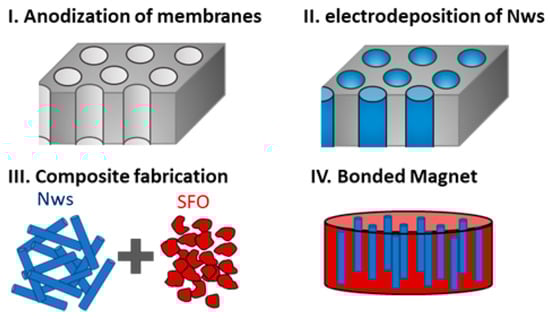 Once the NWs were fully characterized, we evaluated their potential use for the fabrication of composites containing NWs for applications as permanent magnets. In particular, we prepared composite bonded magnets made of CoFe NWs and strontium ferrite (SFO) particles (following the procedure described in Figure 5) in which the NWs are produced by electrodeposition, whereas the SFO nanoparticles are produced by chemical synthesis. Including magnetic NWs, these composites are interesting because NWs increase the saturation magnetization of the composite without decreasing the coercivity, which may result in an increase in the energy product (the figure of merit of permanent magnets). To compare the efficiency of the process in term of both cost and time, we grew electrodeposited nanowires, using different templates. In addition to the AAO templates, we also used commercial polycarbonate templates because, as mentioned in the introduction, these are one of the templates that are more commonly used in applications in which the nanowires are released from the template and used as individual nanomaterials.