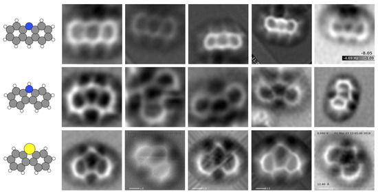 As discussed below, machine learning models trained exclusively with theoretical images completely failed in the classification of experimental images. We have augmented our training data set with 540 images generated with a VAE from three experimental images for acridine, carbazole, and dibenzothiophene taken from Reference [47] (see Figure 3). An additional set of 110 unpublished images [53]—68 for acridine, 11 for carbazole, and 31 for dibenzothiophene—have been used for testing the different classification models. Some of these images are also shown in Figure 3.