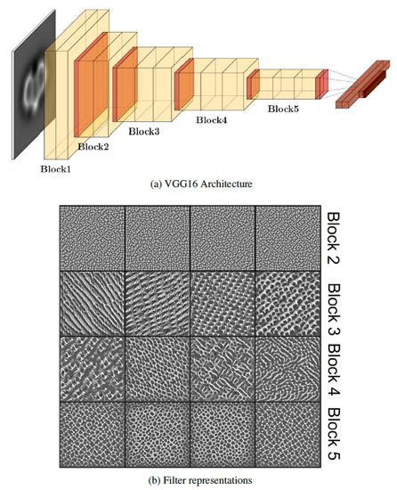At this point, we should recall the basics of the back propagation algorithm used in the training of deep learning architectures. During training, the model performs a prediction resulting in a probability vector. If this prediction is not equal to the target label, this error is propagated from the output layer (the last layer in the model) backwards. The error propagation method calculates the gradients of the loss function computing the chain rule for derivatives to determine the contribution of each neuron in the previous layer to the error and to modify its parameters accordingly. Considering that the depth of a deep learning model like VGG16 is 16 layers (13 convolutional and 3 fully connected layers, Figure 4a, this backpropagation algorithm mostly modifies the deepest layers (those closer to the output layer) while the influence of the first layers on the error reduction is very slight. This is the key to understand why the first layers learn low-level features and their filters remain generic, while the deepest layers specialize in high-level features (See Figure A4).