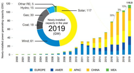 Annual growth of the solar energy market in each development area/country. Although Europe is slowly increasing its production, China is decreasing its yearly rate—overall, the global market is growing largely throughout the years. The inset pie plot presents the net power generating capacity (in GW) added in 2019 for several energy-generating sources, showing that the biggest market growth belongs to solar energy. Adapted with permission from [5]. Copyright 2020 SolarPower Europe.