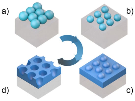 The use of colloids in lithography has been studied for about 35 years, with the continuous development of nano and microfabrication methods reaching increasing potentialities [39]. The methodology (Figure 2) generally comprises two main stages: the patterning mask preparation (Figure 2a,b), followed by the nano/micro-structure production (Figure 2c,d). The process starts with a colloidal deposition technique which is further described in Section 2.2, where we present a large set of procedures that use self-assembled colloidal arrays for surface patterning. The variety of methods that can be used for the colloidal array formation, as well as for the subsequent structure production, shows the high versatility of this method for implementation in various applications.