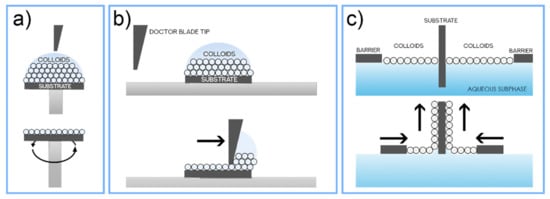 Three techniques should be emphasized when considering the initial step of colloidal monolayer deposition on the substrate of the CL method (see Figure 2a). These are spin-coating, doctor blade, and Langmuir–Blodgett sketched in Figure 4 and described in this sub-section.