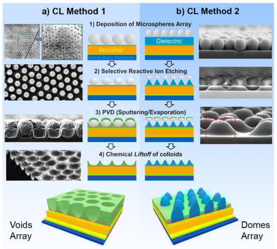 The main difference between both approaches occurs in the first two steps. In the first method (Figure 6a), the selective RIE only acts on the particles, so the final void-like structures are defined by the subsequent deposition of material in the inter-spaces between particles (as in Figure 2c,d). Although in the second method (Figure 6b), the less-selective RIE process also etches the underlying layer, ultimately defining the final dome/cone-like structures obtained.