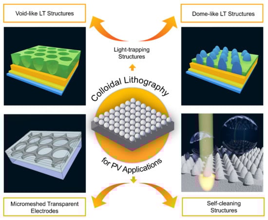 The self-assembled templates from colloidal spheres can provide monolayers with long-range order throughout large device areas, thus providing an inexpensive and easily scalable mask to engineer materials with the physical parameters appropriate for efficient light-trapping (LT) in solar cells. This has led to a significant interest in CL methods for photovoltaic devices, which is the focus of this review. Nevertheless, the CL applications in the PV field are not limited to the integration of LT structures. In the next sub-sections, we will highlight two other promising nano/micro-structuring solutions that have also been demonstrated with CL: namely for transparent electrodes (Section 4.2) and self-cleaning functionality (Section 4.3).
