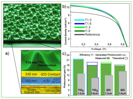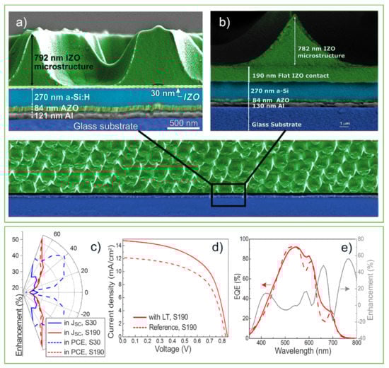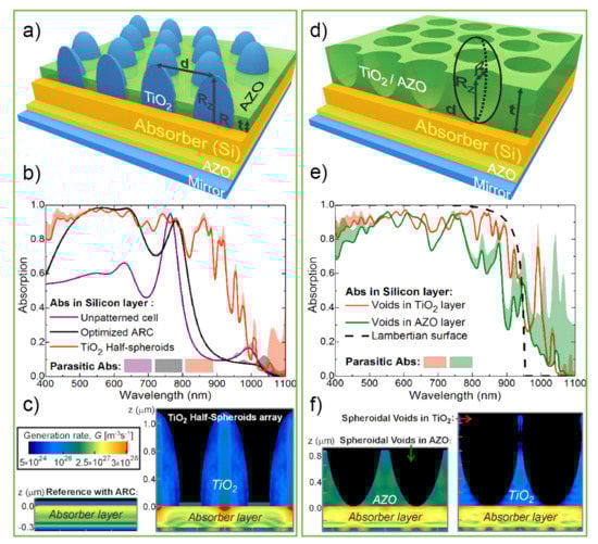 These LT structures are composed of honeycomb arrays of semi-spheroidal features either made of domes (TiO2 half-spheroids separated by a flat aluminum-doped zinc oxide—AZO—layer—Figure 10a) or voids (semi-spheroidal holes in a layer of either TiO2 or AZO—Figure 10d). The electromagnetic field distribution simulations in the thin-film solar cell structures were carried out using a 3D Finite Difference Time Domain (FDTD) method.