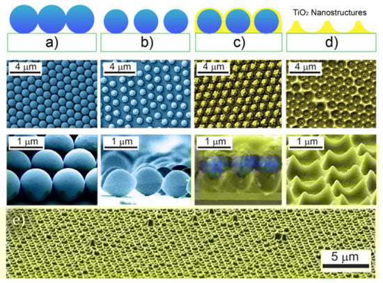 After the deposition of the intended material onto the RIE-shaped colloidal mask in step c) of Figure 2, a lift-off treatment removes the colloids (step d) leaving only the microstructured material on the front surface. After this process, undesirable colloidal residues may be found in the areas previously occupied by the particles, due to incomplete removal. In such cases, besides the chemical removal (e.g., with toluene), both oxygen plasma [115] and thermal annealing [116] treatments can also be used to remove the polymeric particle residues which are usually quite volatile at temperatures around 100 °C.