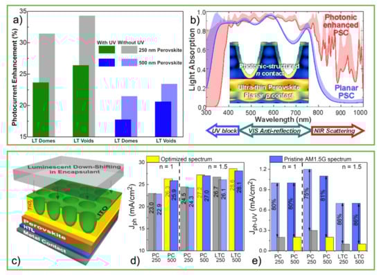Theoretical studies reported by Mendes et al., (2016 and 2018) [142,149] have sought for designs of wavelength-sized structures optimized towards maximum broadband light absorption, with the double aim of enabling the reduction of the absorbing layer thickness (potentiating flexibility) while improving the efficiency of thin solar cells (Figure 10). Two geometries of front-located photonic structures were pointed out, compatible with the CL fabrication methods of Figure 6, and computationally optimized to maximize absorption without degrading the electrical performance of the devices (by avoiding increased recombination since the absorber layer remains flat, i.e., it is not corrugated as occurs with texturing).