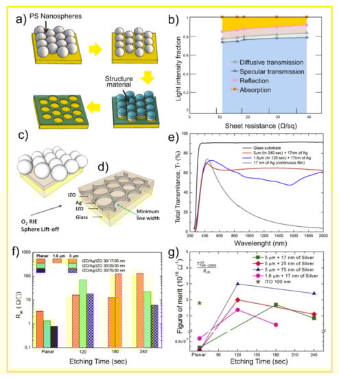 Micro-meshed electrodes (MMEs) obtained by CL have been one of the most promising approaches to produce industrial-compatible transparent conducting materials (TCMs), with excellent optical transmittance and electrical conductance, composed of TCO/metal/TCO multilayers (TCO = transparent conductive oxide). In particular, replacing the intra-layer metallic film (usually silver) with a micro-grid of the same material has allowed additional degrees of freedom to optimize the TCM performance, namely enabling much higher transparency in the red-NIR (near-infrared) spectral range while maintaining highly conductive TCMs [62].