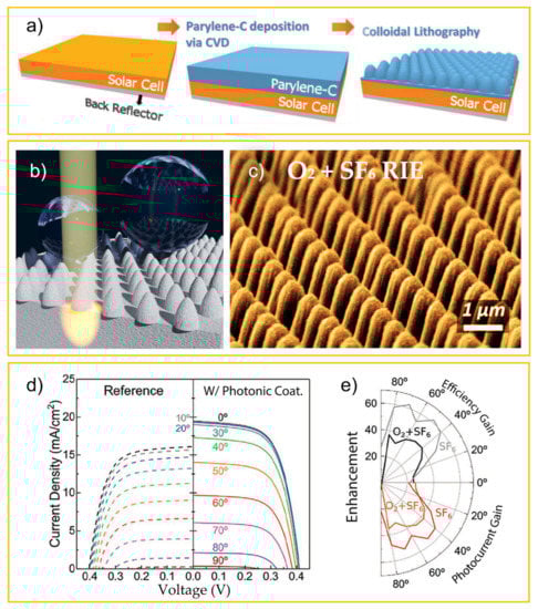 In 1981, a lithographic method using self-assembled PS monolayers as a mask was first proposed by Fisher and Zingsheim [71]. Afterwards, Deckman and co-workers successfully increased the mask area for patterning [72]. Owing to the size, shape, and monodispersity, colloidal particles can self-assemble into 2D or 3D extended periodic arrays, but the 2D colloidal crystals are those that captured the most attention for PV application [53,73,74].