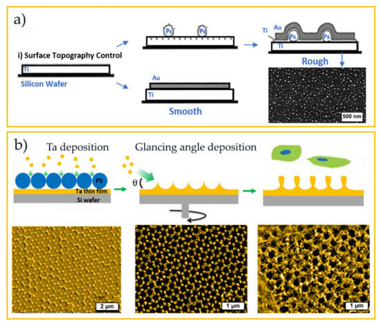 - Wang, P.-Y.; Bennetsen, D.T.; Foss, M.; Ameringer, T.; Thissen, H.; Kingshott, P. Modulation of Human Mesenchymal Stem Cell Behavior on Ordered Tantalum Nanotopographies Fabricated Using Colloidal Lithography and Glancing Angle Deposition. ACS Appl. Mater. Interfaces 2015, 7, 4979–4989. [Google Scholar] [CrossRef] [PubMed]