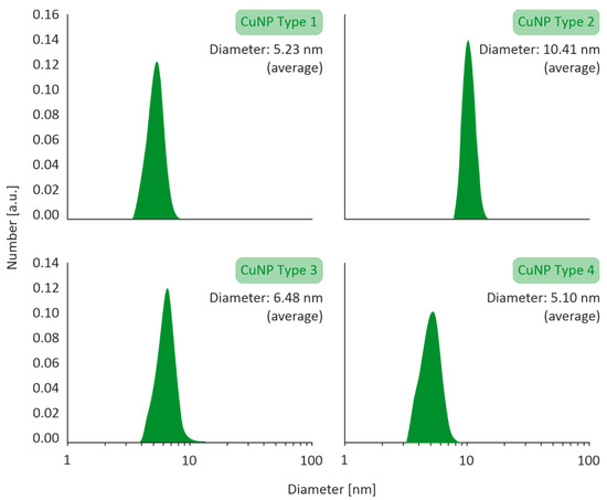 The size distribution profiles of the CuNPs are illustrated in Figure 1. All types of CuNPs exhibited closely clustered population of monodispersed NPs, with average diameters ranging in between 5.10 and 10.41 nm.
