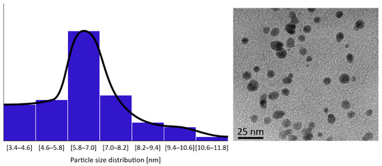 HR-TEM images of the CuNPs indicated that all the four types were of a spherical morphology, with an average size between 5 and 10 nm. An HR-TEM image of CuNPs along with its image-based size distribution is indicatively depicted in Figure 2. It should be noted that TEM measurements are expected to lead to slightly smaller size distributions of the NPs than DLS (shown in Figure 1), as DLS measures a hydrodynamic diameter of the NP.