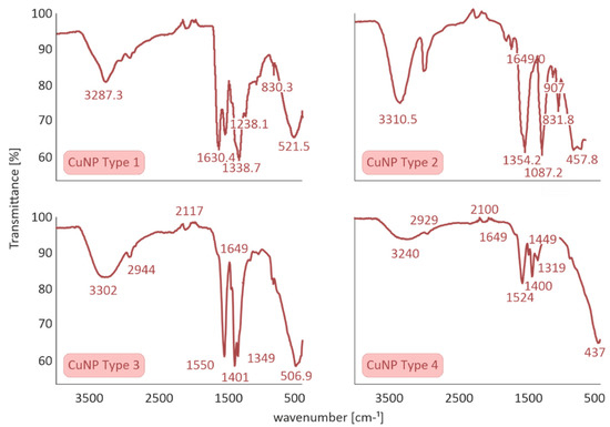 With respect to the above, the ATR spectra of CuNPs Types 3 and 4 were evaluated to determine the interaction of S3 with CuNPs. The ATR spectra of all four Cu species are summarized in Figure 3.