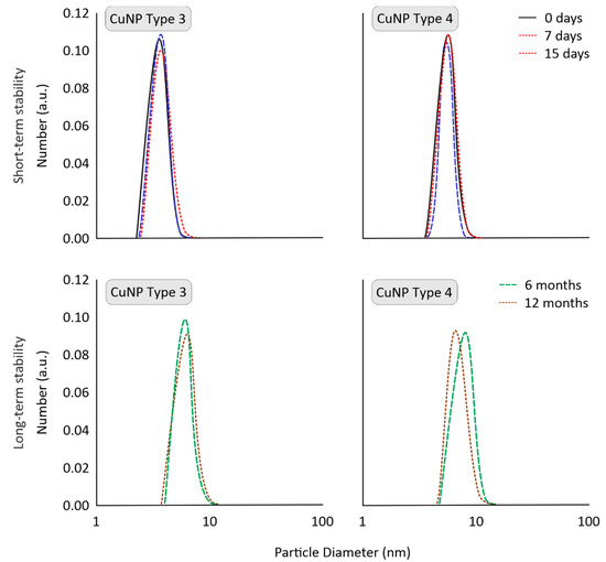 In the present study, the short-term stability of CuNPs was evaluated after their two-fold dilution in tap water. CuNPs stability was estimated at 25 °C for 15 days to observe any aggregation (visual observation) or extreme changes in average size and size distribution. CuNPs Types 1, 3, and 4 remained stable with respect to optical observation (no changes in color or aggregation), size, and size distribution (see Figure 4). This important aspect could be attributed to the synergistic effect of stabilizer on both the surface of CuNPs (small size and stable nanoparticle) and also on the final formulation (homogeneous stable dispersion). Only CuNPs Type 2 were mildly affected as to their size distribution profiles. The size distribution of CuNPs Types 3 and 4 are indicatively presented in Figure 4.